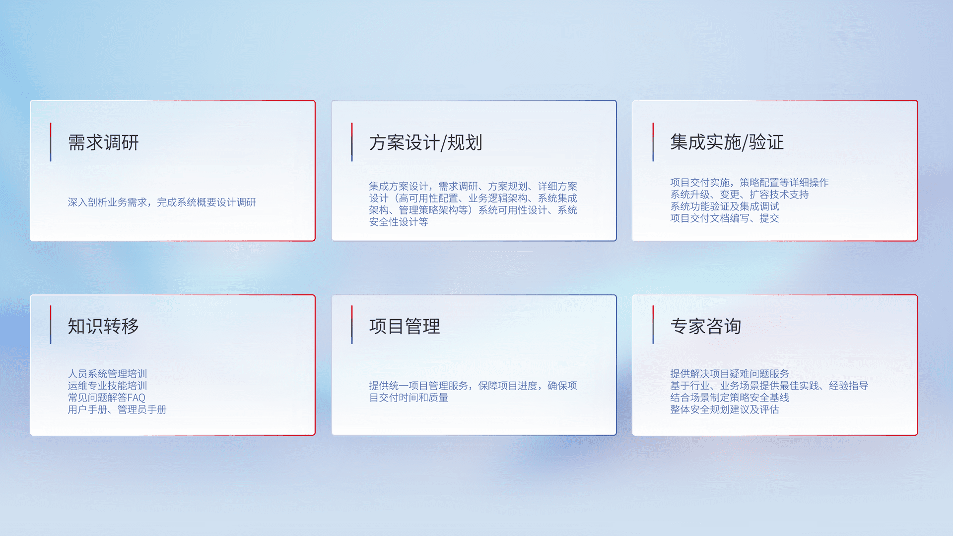 针对客户行业特性,,将宏观的安全战略和需求,,,,通过专业的交付服务,,实现项目落地,,,为客户提供标准规范的集成交付服务。。